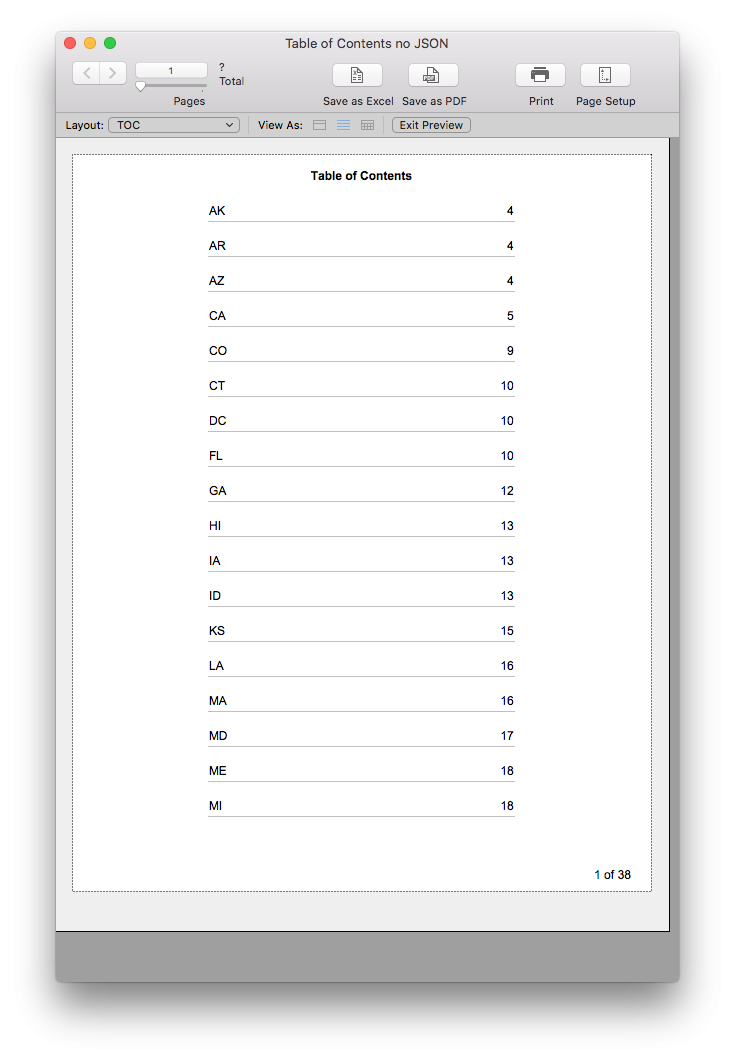 After a bit of transformation of the data it generate a table of contents by use of a Virtual List. Then it computes the how many pages the Table of Contents there are and offsets this value for every page of the report then it will output a PDF to the desktop firstly the Table of Contents then append to that PDF the report itself.