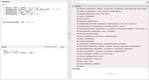 The DataBox is a free FileMaker plugin that allows creating and manipulating of data in computer memory. You can store data like variables, arrays, tables or any hierarchical structures and manipulate them.