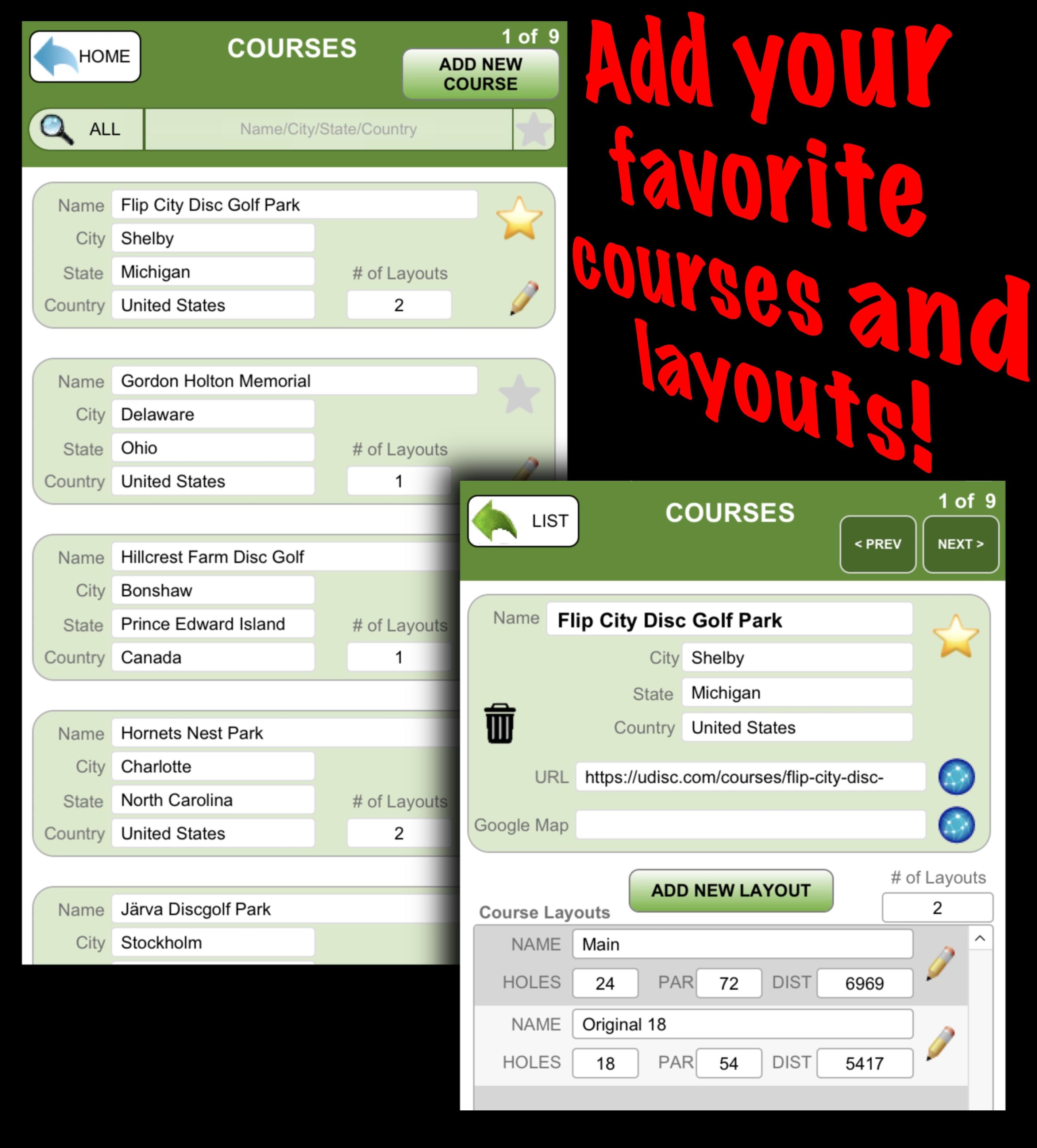 •Add courses and layouts, easily entering their hole, par, and distance information