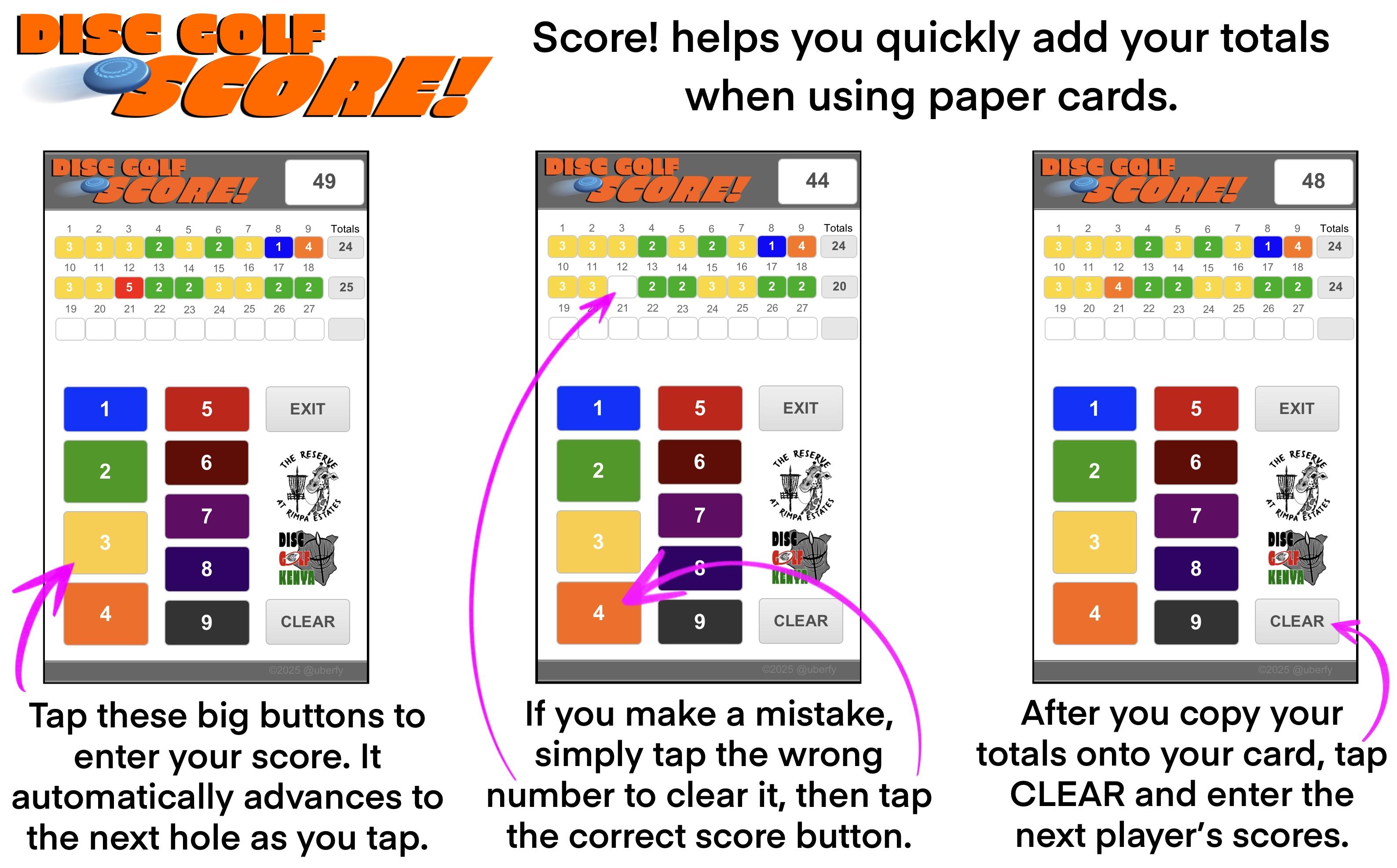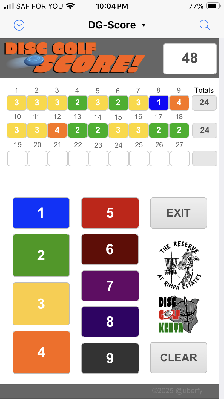 Disc Golf Score! helps you quickly calculate your totals when using paper score cards. It works for golf and disc golf, up to 27 holes in one round. What's New in Version 1.0.0 See changelog Released February 25, 2025Feb 25 Edited one of the screen shots. 1.0.0 1.0.0 February 25, 2025Feb 25
