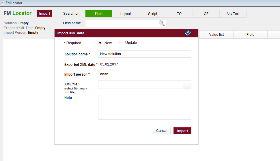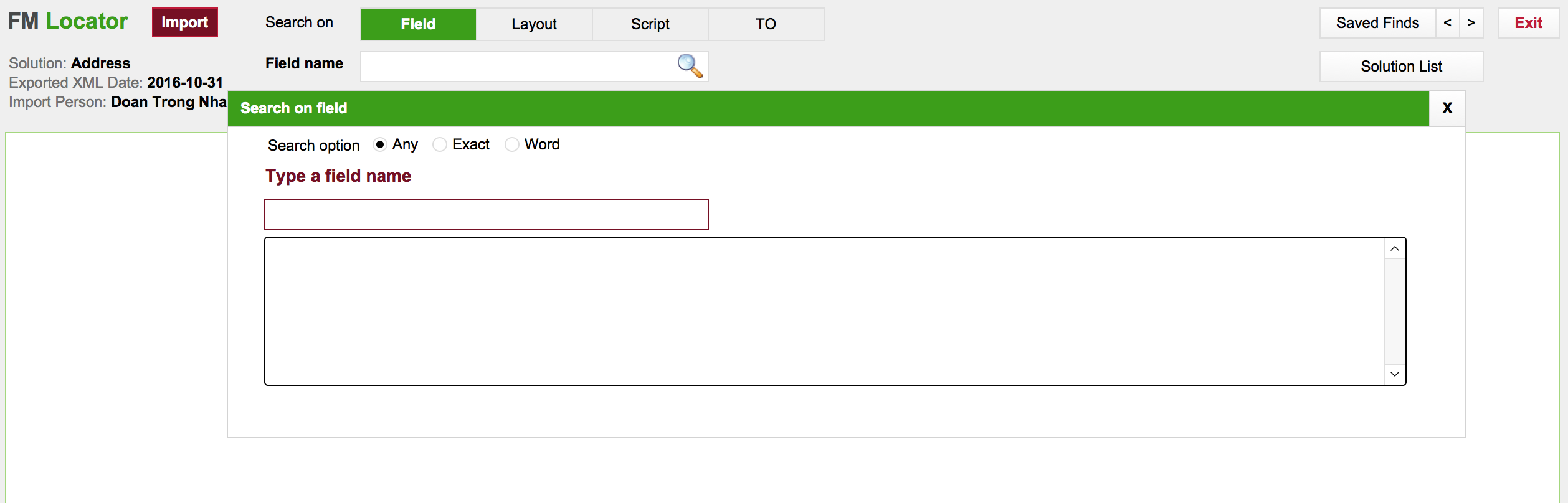 This file is a small FileMaker-based tool whose input is the XML data of Database Design Report exported from Filemaker.