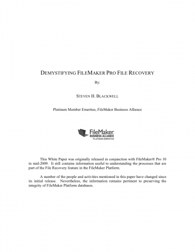 This White Paper details the FileMaker Platform Recovery process. Originally released with FileMaker® Pro 10, it still contains much information useful today about the process and its 16 separate steps.