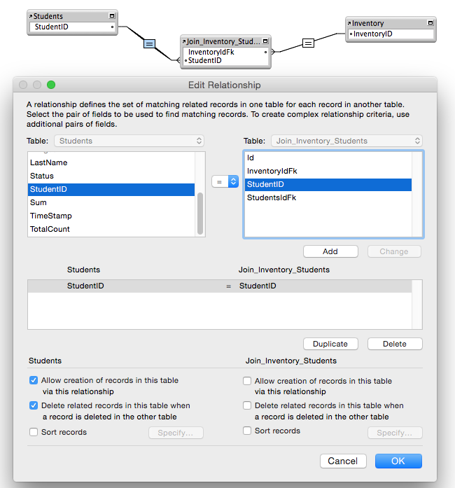 comment Posted January 3, 2017 Posted January 3, 2017 2 hours ago, TaiChi56 said: First I want to make sure that I have my relationship set up correctly That's hard to tell without understanding what your solution is designed to track in real life. For example, are you sure you need multiple "Inventory" records for each student? IOW, do you issue the same kit to the same student more than once? I also suspect that tracking the return of the items could (and should) be done using the same record that recorded the initial issue.