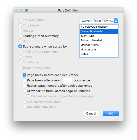 cbombeck Posted January 9, 2017 Posted January 9, 2017 Hello! I have a report setup with a sub summary sort, and it works great. When I go to print the report, I would like the sub summary row to print at the top of each page - is this doable? I already have it set to do a page break after each section, but if the pages get mixed up, there would be no way to tell what sub section they belong to. Any and all help is appreciated. Thanks! Using Filemaker Pro 15 Advanced on a Mac