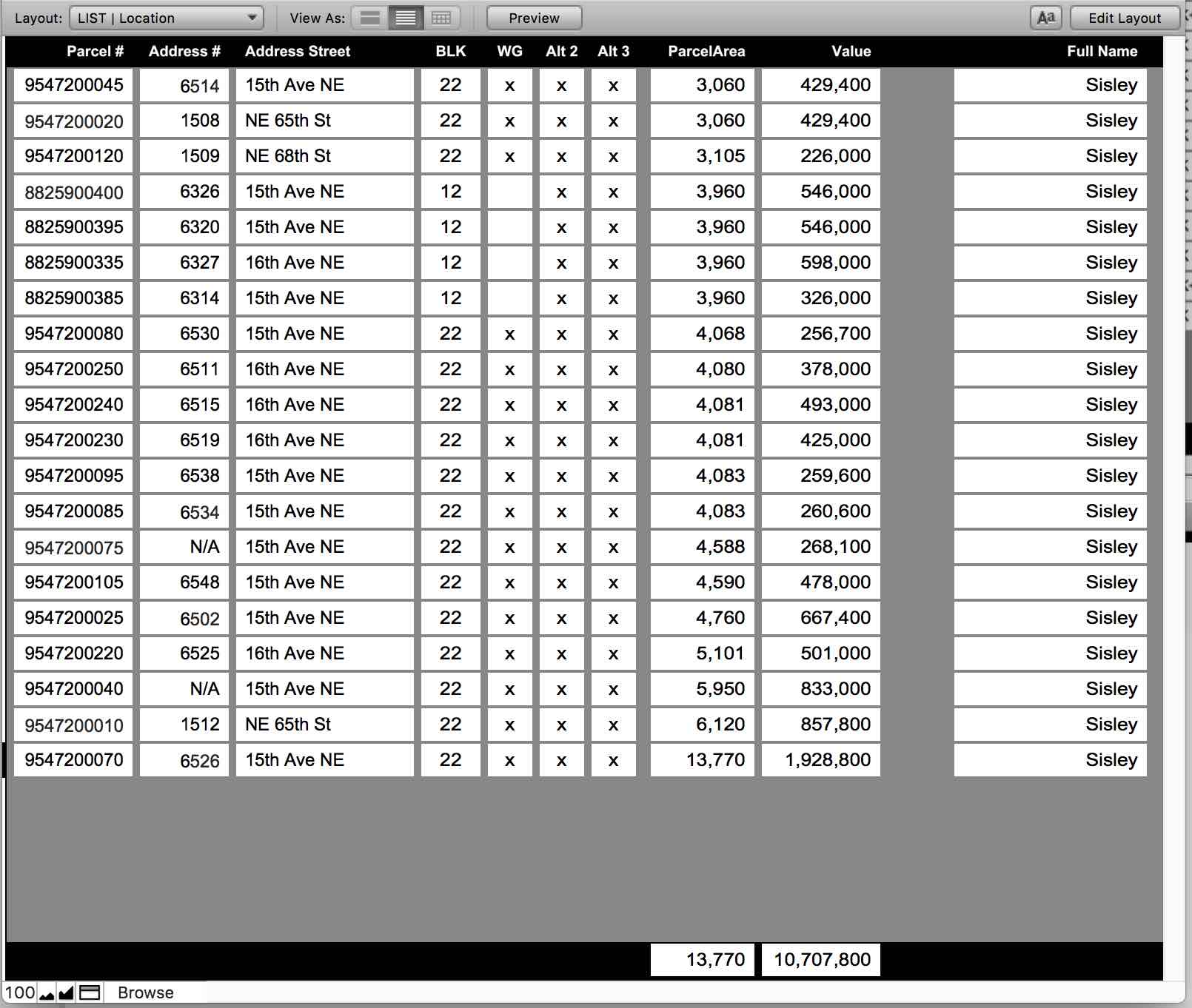FMRadio Posted July 26, 2017 Author Posted July 26, 2017 (edited) Quote Parcel table into a calculated field in the Neighborhood table. I.e., make a calculated field in Neighborhood like so: related::parcel. You can then summarize this field. Thanks for your response. I thought a picture might be worth a thousand words, or so they say. I uploaded a screenshot of the table Neighborhood. Basically, the table is an elaborate calculator, the idea being to find sets of properties based on some criteria and get total values at the bottom of the window. Those totals could be total square feet or a total of land values. The find criteria might be the block property is located on or one of the alternative rezoning proposals. In the screenshot, all of the fields shown are from the Neighborhood table, the primary table. The only exception is the field labeled Lot Area (Parcel :: ParcelArea) which comes from the related table Parcel. The Parcel# field, at the far left, is the field that links the two tables with property parcel number. At the bottom of screenshot in the footer is the field ParcelAreaTotal, in line with the field Lot Area (Parcel :: ParcelArea), where the totaled value is to be shown. As you have pointed out and as I have read, you cannot use a summary field for this operation. But, so far, my attempts at using a calculation field have failed. You can see that value in ParcelAreaTotal is not a total of the found list but is the value of the currently active record 9547200070. This is my central question, how do you use a calculation field in this situation to total a value located in another table? Thank you. Privacy: The information in the screenshot is not private data. Public data from the online county records and the properties shown are from a commercial developer. Edited July 26, 2017 by FMRadio Incorrect Image