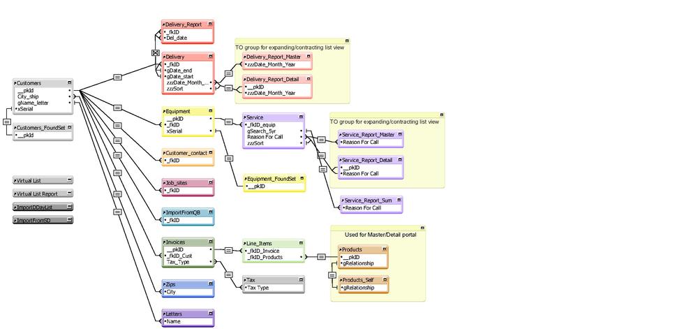 Steve Martino Posted August 1, 2017 Posted August 1, 2017 (edited) Hello forum. After upgrading (finally) to FM Adv 16, I've started a rebuild of my database. The current one has been in use for about 4 years, works really well for me (single user). I had a few things that weren't quite right in my mind, so I'd like to fix them with this rebuild. This is a database for a heating oil delivery/commercial fueling/HVAC business. The relationship question is about how to handle different types of customers, and their different attributes. Current design has all customers in one table, and therefore attributes that apply to one type don't apply to the other type. I figure it's not best to have 30+ fields in a table that apply to only one type, and 15 that apply to only the other type. I also manage customers with a table for Interactions-email, newsletters, bill collecting. The first type of customer is a Heating Oil delivery customer. Heating oil customers usually only have one location, with related equipment (one or more). The second type is a Commercial Customer. Commercial customers have related jobs in different locations. Attributes that are similar: -Name, delivery address, phone number, email address, etc.-basic info Attributes that differ: Heating Oil -Tank Size -Usage tracking (about 20 fields) -Deliveries made (about 10 attributes) -Equipment -Service performed on the equipment. -Automatic Delivery scheduling -Invoicing for deliveries and service repairs & related products -Interactive map to show location and nearby Heat customers. Commercial -Related table of jobs and sites (about 10 attributes-different from Heat customers). -Deliveries made (about 5 attributes-different from Heat customers). -Different interactive map to show location and nearby Commercial customers. So the questions arise out of reporting and some of the questions I have are: 1. Should they be in 2 different tables? If so, I guess they would each need their own related tables for deliveries made, and for interactions. a) Or would I connect them to the same tables as 2 different TOG's. 2. If they are 2 different tables, do I then create another TOG and attach both to an Invoicing Table. Then I would guess it would make reporting much easier as I could report on all deliveries from the Invoice table with sub-summaries by name and type of delivery. This is basically what I do currently, but am using QuickBooks. I'd like to create the reports all from FM as I can use the Interactions table to generate all needed correspondence. 3. Or, should I keep all customers in the same table and make one-to-one relationships of their unique attributes, reducing the number of fields in the main customer table. a) If so, do I then go with anchoy bouy and multiple TOG'S? Another thought would be for Commercial Customers, make one main record for each job, something like: -Acme-South St. Philadelphia -Acme-Sproul Rd. Broomall Then by having a one-to-one of related attributes, reporting would appear to be easier Attached is the graph for the current-in use DB Well thanks for reading. If you need more detail, I'd be happy to supply. Any thoughts, comments always appreciated. Thanks Steve. Edited August 1, 2017 by Steve Martino more info.