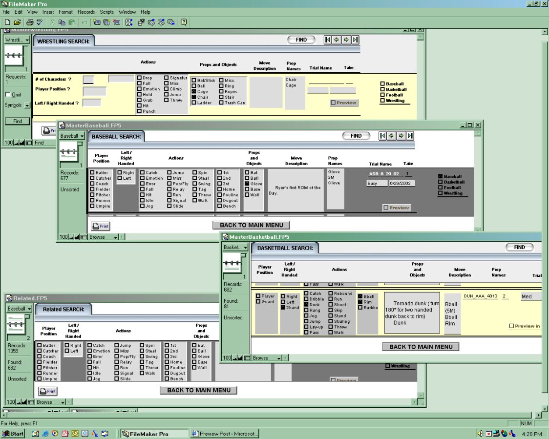 Ugo DI LUCA Posted January 16, 2003 Posted January 16, 2003 Looking at your previous posts, you seem to be stuck with this for a while. So take some lines to exlain what kind of search you are performing, into which file, for what reason. Even give an example of the search and the result you intend to come with Searching all the males left handed that jump ? Next What are the files you have in your database ? I think you do have a Players db. If so, I still think the four files shown in your example do relate to this file.