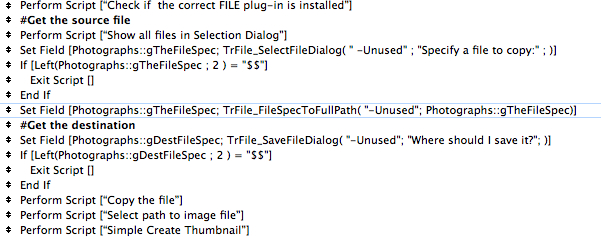 cknight Posted February 16, 2007 Posted February 16, 2007 I have run into a problem developing a solution and i ve kind of hit a brick wall but before i tell you more about my wall let me first say that the Troi File Plugin is truely an amazing product. My Problem: I have created scripts to copy and move image files to a folder on the database drive and I have gotten it to create thumbnails to populate those containers. However, I have found that i need to write the file extension in the save dialog otherwise it wont fill the container. Is there a way for it to read the File extension and append it in the save dialog when i copy the file to my database drive. I have pasted the script steps i have used mb you can see where i made the mistake. Secondly I was wondering how you would recommend scripting a duplicate record for a record containing a file in a container field especially if it is a thumbnail and not the actual file. I am really stumped on this one. I would assume the script would involve the following steps 1. Get file path and set a global field 2. Set the destination path 3. Copy the file & rename ( not sure how to script this one) 4. duplicate record 5. create thumbnail & insert in Container field I would prefer to have the destination path the same as the location its copying from but just append the new name and extension on it that way the user doenst see it happening it just duplicates. I am sure you have been asked this before but I really am stumped and i would like to use this plug in instead of having a super slow database. Script for 1st question