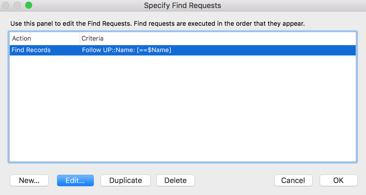 bruceR Posted November 27, 2015 Posted November 27, 2015 There are a couple of ways to do this. It sounds like you really want to do this within one script. The example find that described was the simplest form; but you can do slightly more complex things, with multiple criteria, and with the use of Omit Record where applicable. Set Error Capture [ On ] Enter Find Mode [] Set Field [ Follow Up::Name : Get (Username)] New Record/Request Set Field [ Follow Up::Status ; "Completed"] Omit Record Perform Find[] If you want literally want to do a search on a found set, then you are talking about the Constrain Find script step. Note that this is also available in the menu; and in the contextual commands when you click in a field. Anyway: Enter Find Mode [] Set Field [ Follow Up::Status ; "Completed"] Omit Record Constrain Find[]