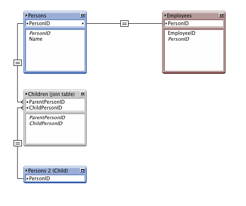 comment Posted December 8, 2015 Posted December 8, 2015 2 minutes ago, Marcwa19197 said: a person can also be be a child Did you perhaps mean that a person can have a child? If I read this correctly, you have a one-to-one relationship between Persons and Employees (not sure why you need this, but let's leave it for now) and a one-to-many relationship between Persons and Children. Your relationships graph could look like this: Note that there is no direct relationship between Employees and Children (and no EmployeeID in the Children table) - they are already related through their common parent table Persons. You can place a portal to Children on a layout of Employees and it will show all the children of the currently viewed employee. If for some reason you wanted to create Children from a layout of Employees (again, I don't see why you would want to), you could use another occurrence of the Children table and relate it to Employees using PersonID as the matchfield (not EmployeeID as shown in your graph). But I don't see why you could not do all your data entry from a layout of Persons: use a portal to Children to create the children, and related fields from the Employees table placed directly on the layout to both create and fill out the necessary details for an employee.