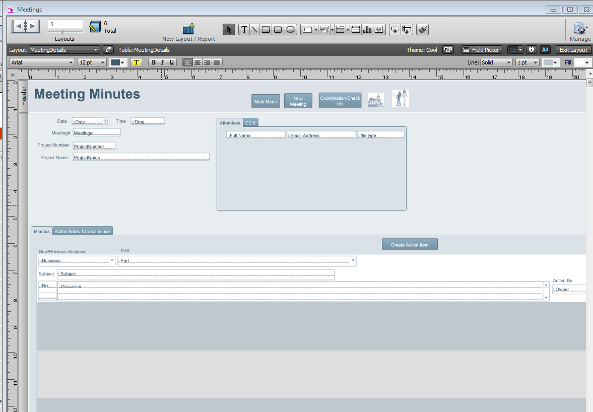 Lori Posted May 11, 2016 Posted May 11, 2016 I have a projects database and a meetings database. these are separate files. In the meetings database I want to have one project (from the projects file) and all the meeting associated with that project. At the present time I have a layout (Meetings) with the project number and name. What I want is to be able to create Meeting #1....Meeting #2....Meeting #3. Then each meeting will have numerous topics, minutes, previous business, new business... At this time I have the database set up so that each new meeting has to have a new record which includes the project number as well so that means I have numerous records for the same project. I have a portal that has the minutes item number which I have attached a snapshot of below. I hope I have described my situation clearly enough to get some feedback. the question is....am I on the right track or should I be structuring my database differently... Tables: MeetingDetails, Minutes, Action Items Any suggestions would be greatly appreciated. Thank you, Lori