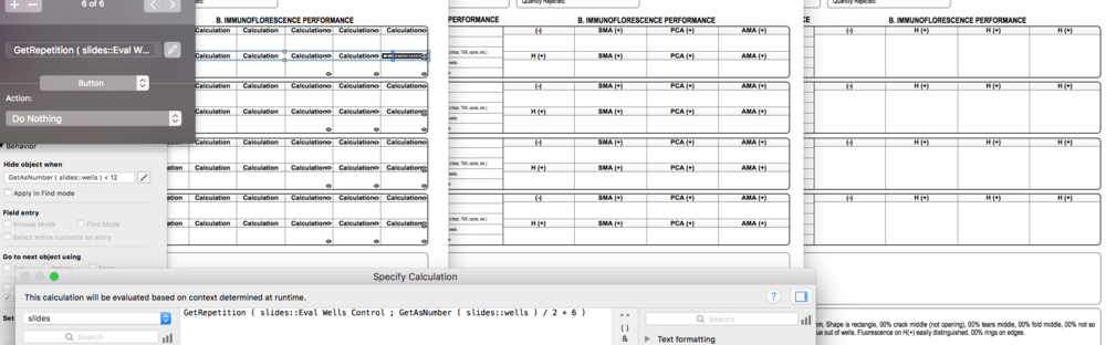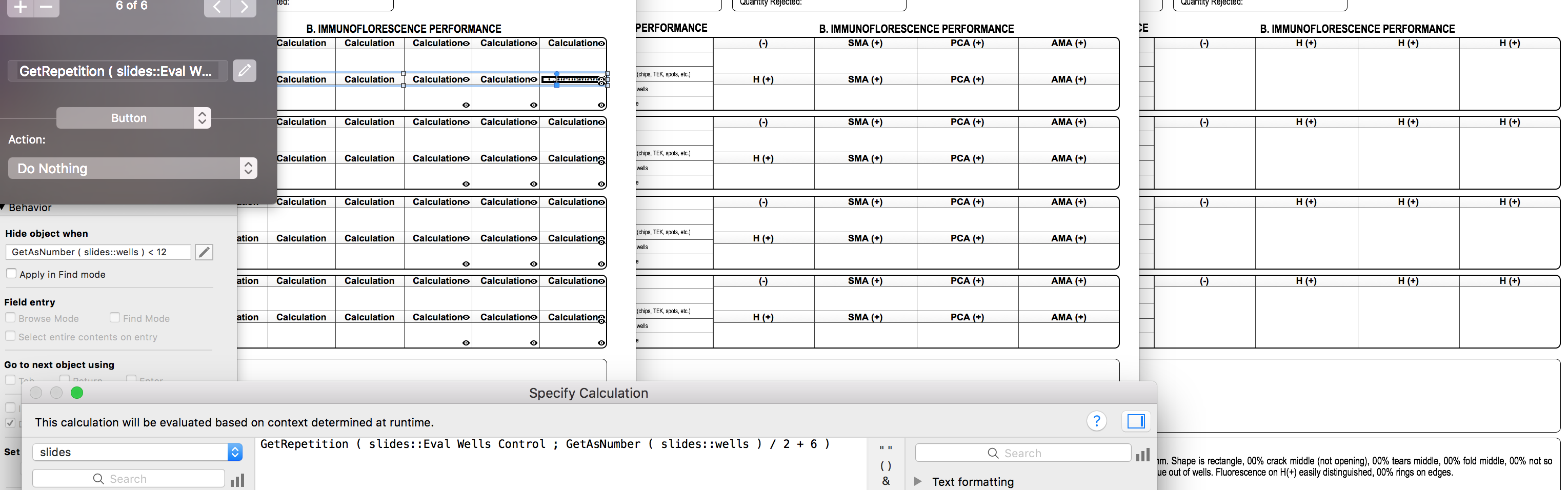 Ocean West Posted May 26, 2016 Posted May 26, 2016 I have 4 layouts for a form that we print and the script goes to the layout for the form 4/6/8/12 depending on the data (wells) in the record. It turns out they need to batch print and its convoluted to write a print a script to switch layouts in an automated fashion. So I had revised it by using hide object when and stacked all the elements up on the layout but it turns out to be rather ugly in layout mode. this was using repeating fields in order to get the desired data to show. But then i decided on a better method - using button bars and hide objects. This essentially does the same thing but much easier to see in layout mode. Now I can write a script to print the found records and the proper form will print based on the data The segment or button bar will hide based on the record type, and the data displayed is also calculated and evaluated on the fly. 1
